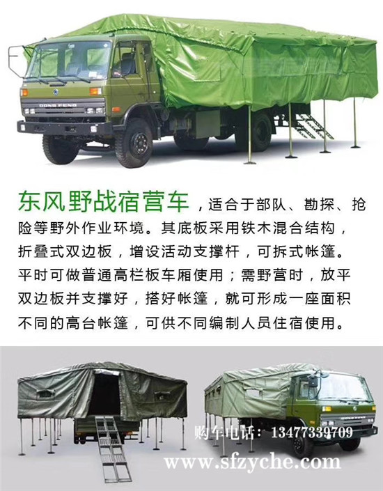 東風(fēng)原廠EQ5118XZS6D15型宿營車EQ5120GA1型天錦宿營車6.1米篷布配套直供。適用于東風(fēng)EQ5118XZS6D15宿營車和EQ5120GA1天錦宿營車等東風(fēng)系列車型,軍用宿營車供部隊(duì)野外住宿使用。車箱內(nèi)部尺寸6100mmX2210mmX1850mm。宿營車車廂在采用折疊式雙邊板,增加滑道內(nèi)設(shè)支撐桿,可拆式帳篷。平時(shí)可作為普通高欄板軍車使用;部隊(duì)需野營時(shí),放平雙邊板并支撐好,搭好帳篷,就可以形成一座面積達(dá)38㎡的高臺帳篷,可供36人住宿用。 東風(fēng)原廠宿營車篷布總成價(jià)格一套為5300元含稅。