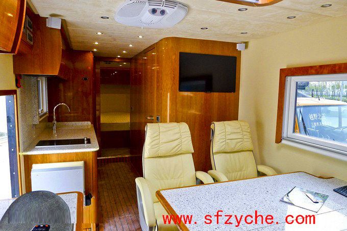 六驅越野房車車身內整體豪華配置:在駕駛室中還有主流卡車中配備的天窗通風系統(tǒng)和后排折疊床板,這款越野房車的后排內部具有地板加熱系統(tǒng),獨立的會客廳,高級絨布真皮座椅具備多項可調功能,雖然包裹感不是很強,但卻有一定的支撐性,更加符合越野房車的特質。此外,中央空調、天窗與側窗外加頂部迎賓燈的點綴是恰到好處,前后對著的兩臺大尺寸液晶電視方面中央四位乘客觀看。在門口的兩側,分別是吧臺和迷你廚房,電磁爐、微波爐、冰箱應有盡有。車門頂部設有整車電路控制面板,可通過開關控制燈光、車門等等。干濕分離的衛(wèi)生間分別分布在客廳旁與臥室中,其中一間設有浴盆和真空馬桶,另一間則配有恒溫淋浴,走廊的盡頭就是這間臥室,其擁有電控臥室門,獨立中央空調、屋內整體照明系統(tǒng)與液晶電視,此外整間臥室采用了實木裝潢,超寬的雙人床鋪足夠車主享用。