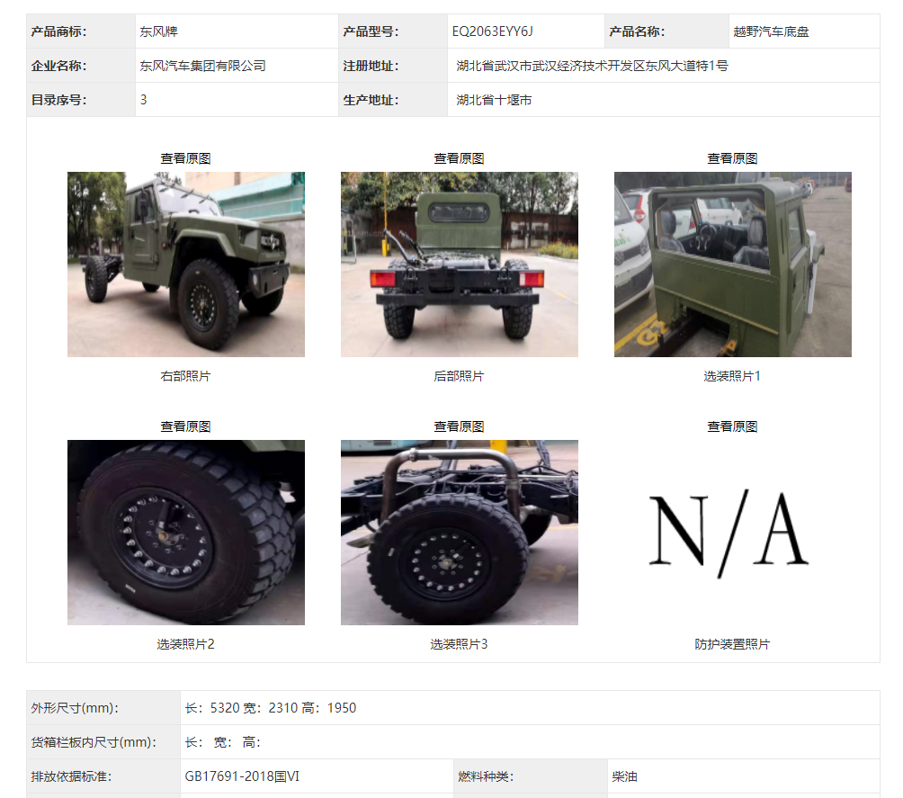 東風猛士民用版EQ2063EYY6J型四驅越野汽車底盤在340批次公告中公示成功!