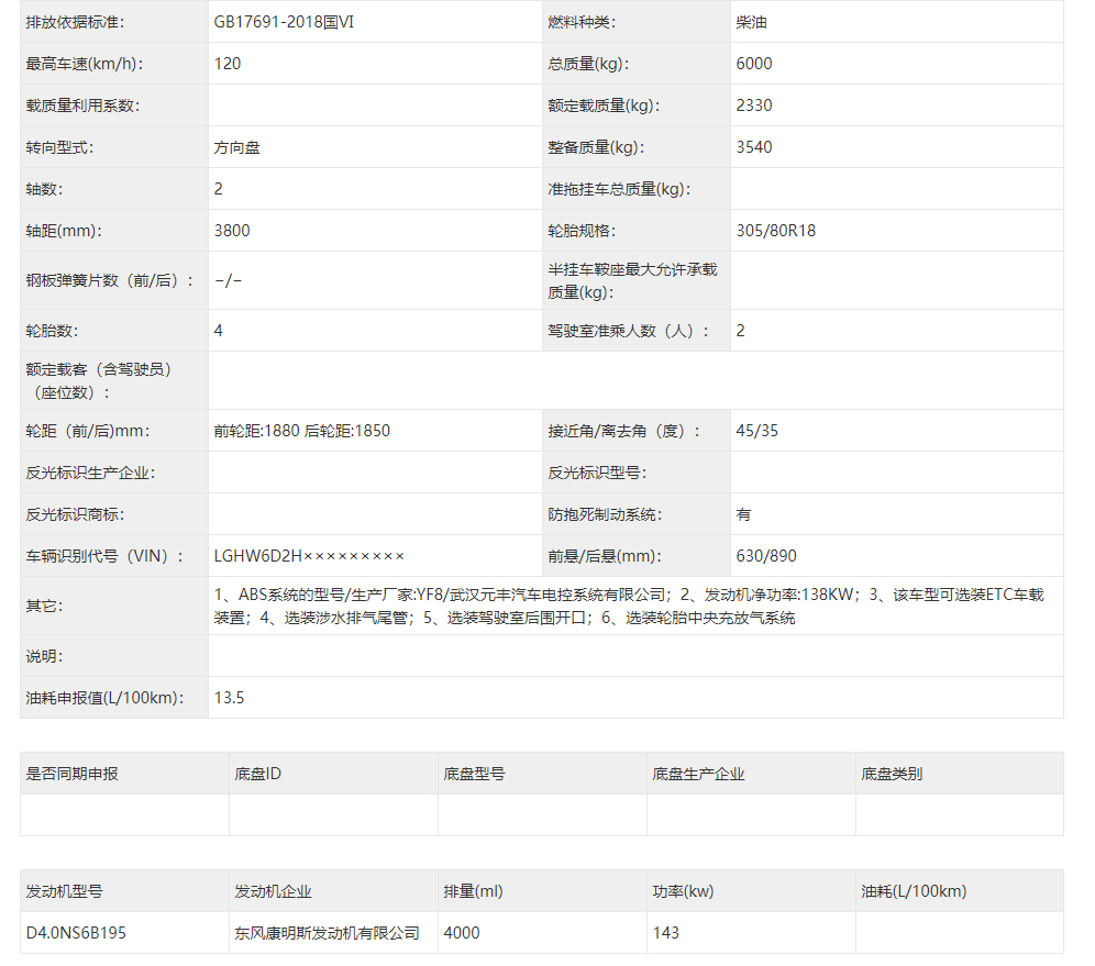 東風猛士民用版EQ2063EYY6J型長頭單排四驅越野底盤其它參數(shù):1、ABS系統(tǒng)的型號/生產廠家:YF8/武漢元豐汽車電控系統(tǒng)有限公司;2、發(fā)動機凈功率:138KW;3、該車型可選裝ETC車載裝置;4、選裝涉水排氣尾管;5、選裝駕駛室后圍開口;6、選裝輪胎中央充放氣系統(tǒng);7、排放依據(jù)標準:GB17691-2018國Ⅵ。