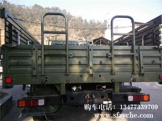 東風(fēng)國(guó)五天錦EQ1120GA2型運(yùn)兵車,4×2驅(qū)動(dòng),D530平頭一排半平頂駕駛室,,軸距3800mm,康明斯ISD245 50國(guó)五排放245馬力,6.7升發(fā)動(dòng)機(jī),八擋變速箱,帶電加熱(預(yù)熱塞)冷起動(dòng)裝置,全鋼全鋼 主油箱160L,80L副油箱,Φ395mm推式膜片彈簧離合器,東風(fēng) 4.5噸前橋,9噸后橋,主減速比5.286,車架斷面250×80×(7+4)mm,鋼板彈簧片數(shù)7/9+6,9.00R20鋼絲胎,電動(dòng)玻璃升降器,中控門鎖,通道式儀表板,帶空調(diào),車廂內(nèi)部尺寸為4950x22325x600mm鐵木混合結(jié)構(gòu),邊板帶坐凳,板材采用國(guó)標(biāo)鋼材,邊板1.2mm,底板為3mm的花紋鋼板,車廂底橫梁用槽鋼加固,車廂縱副梁全槽鋼結(jié)構(gòu),能滿足客戶運(yùn)輸重型貨物,適應(yīng)部隊(duì)野外使用及冰雪路面行駛要求。全面繼承東風(fēng)40多年軍車越野車制造經(jīng)驗(yàn),動(dòng)力總成匹配合理,生產(chǎn)技術(shù)成熟穩(wěn)定,整車車輛全面通過(guò)軍檢。