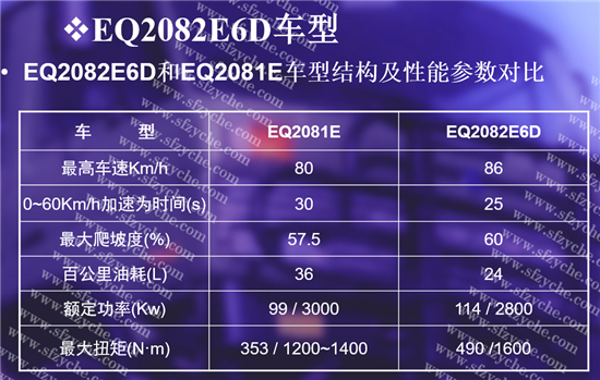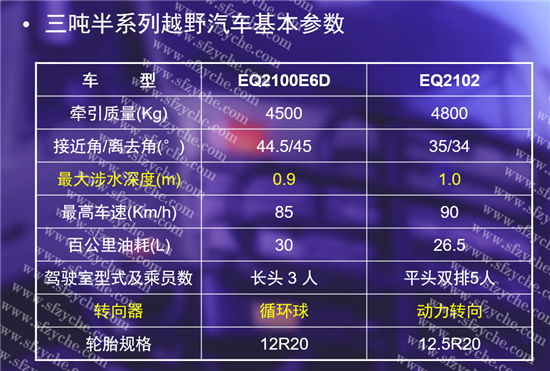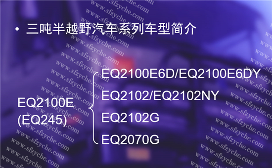 EQ2100E6D車型簡介:EQ2100E6D型三噸半越野汽車是EQ2100E車型的改進(jìn)型,該車型于1995年設(shè)計(jì)定型,1996年投產(chǎn)。主要進(jìn)行了如下7項(xiàng)改進(jìn)設(shè)計(jì):換裝康明斯6BT5.9型增壓柴油發(fā)動(dòng)機(jī)、采用350單片離合器,液壓氣助力操縱、采用動(dòng)力轉(zhuǎn)向系統(tǒng)、采用中央彈簧氣室駐車制動(dòng) 、 采用發(fā)動(dòng)機(jī)進(jìn)氣預(yù)熱冷起動(dòng)裝置  、24V電氣系統(tǒng)及符合法規(guī)的新式電器、儀表和開關(guān) 、改進(jìn)駕駛室總成。