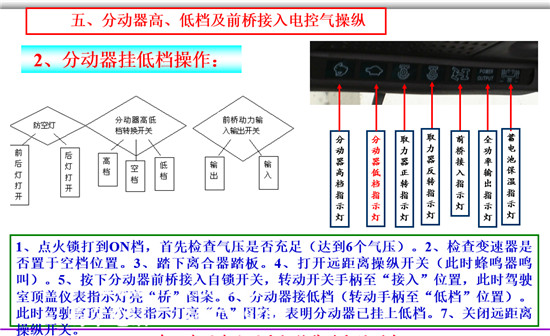 1、點(diǎn)火鎖打到ON檔,首先檢查氣壓是否充足(達(dá)到6個(gè)氣壓)。2、檢查變速器是否置于空檔位置。3、踏下離合器踏板。4、打開遠(yuǎn)距離操縱開關(guān)(此時(shí)蜂鳴器鳴叫)。5、按下分動(dòng)器前橋接入自鎖開關(guān),轉(zhuǎn)動(dòng)開關(guān)手柄至“接入”位置,此時(shí)駕駛室頂蓋儀表指示燈亮“橋”圖案。6、分動(dòng)器接低檔(轉(zhuǎn)動(dòng)手柄至“低檔”位置)。此時(shí)駕駛室頂蓋儀表指示燈亮“龜”圖案,表明分動(dòng)器已掛上低檔。7、關(guān)閉遠(yuǎn)距離操縱開關(guān)。