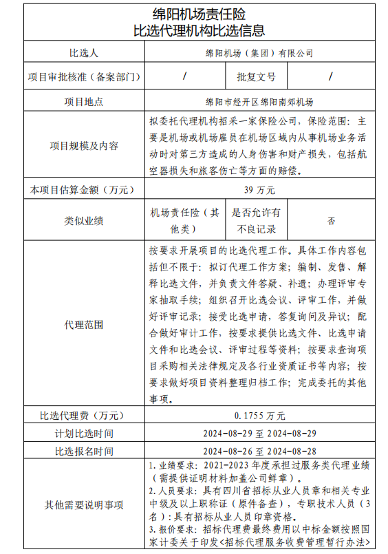 綿陽機(jī)場(chǎng)責(zé)任險(xiǎn) 比選代理機(jī)構(gòu)比選信息