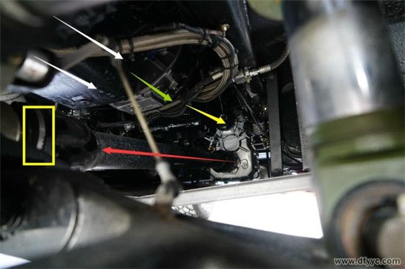 東風(fēng)四驅(qū)裝甲防雷反恐戰(zhàn)車為前置動力、實(shí)時四輪驅(qū)動設(shè)定,縱置發(fā)動機(jī)(白色箭頭)直接與變速器(綠色箭頭)剛性連接,通過中間傳動軸(黃色箭頭)至分動器,在經(jīng)過前傳動軸(紅色箭頭)與后傳動軸將動力輸出至前后驅(qū)動橋。